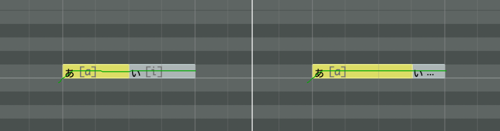 初音ミク | 「あい」の発音が不自然になるときの対処方法 初音ミク 2025.07.192024.06.18 初音ミクの「あい」の発音が不自然になるときの対処方法を説明する。 結論 「い」を短くすると多少自然になることがある。 左の画像 : 変更前、右の画像 : 変更後 まとめ 初音ミクの「あい」の発音が不自然になるときの対処方法を説明した。